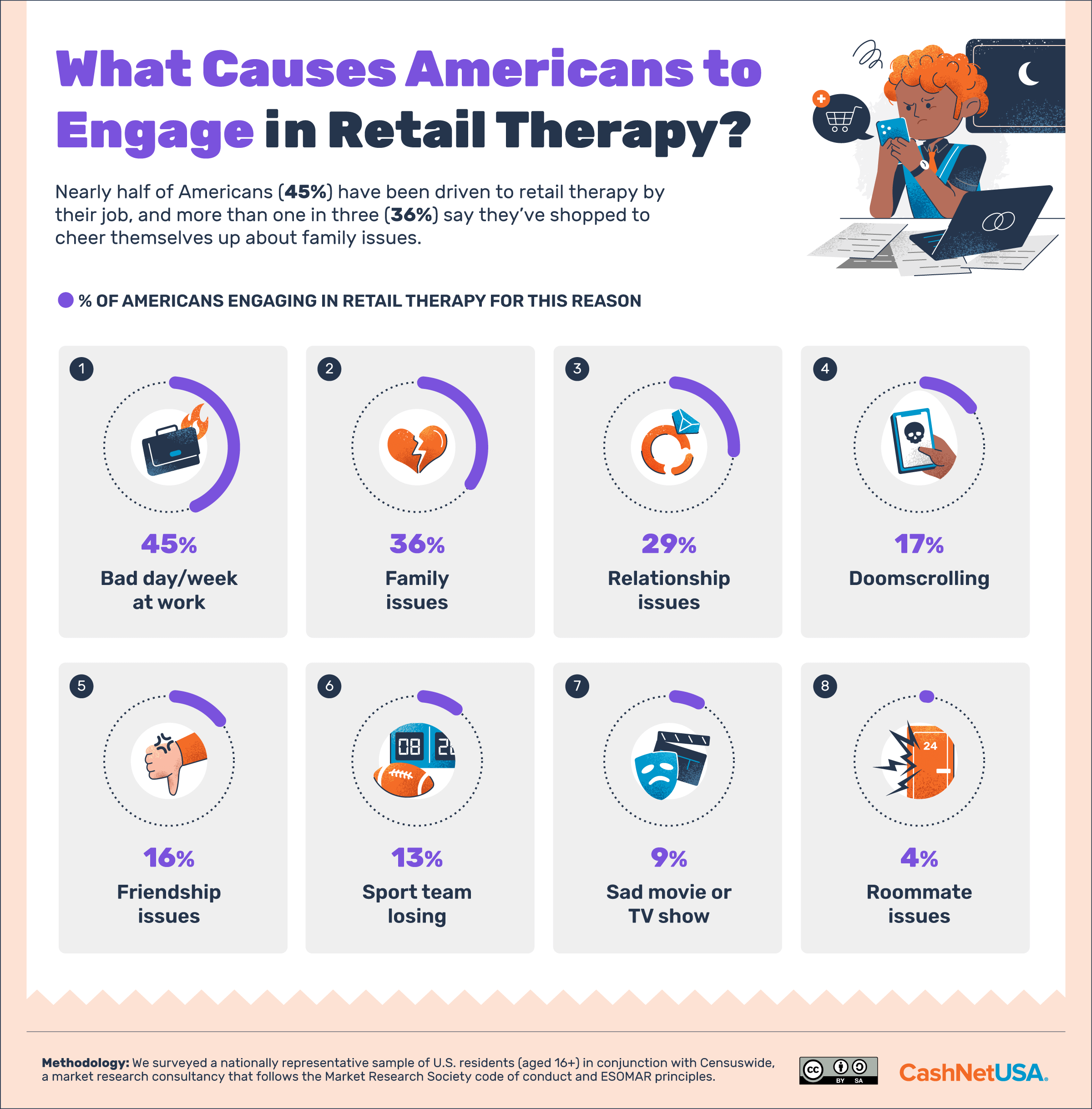 - Some 45% of Americans report shopping to comfort themselves after a bad day/week at work, making it the leading cause of retail therapy.