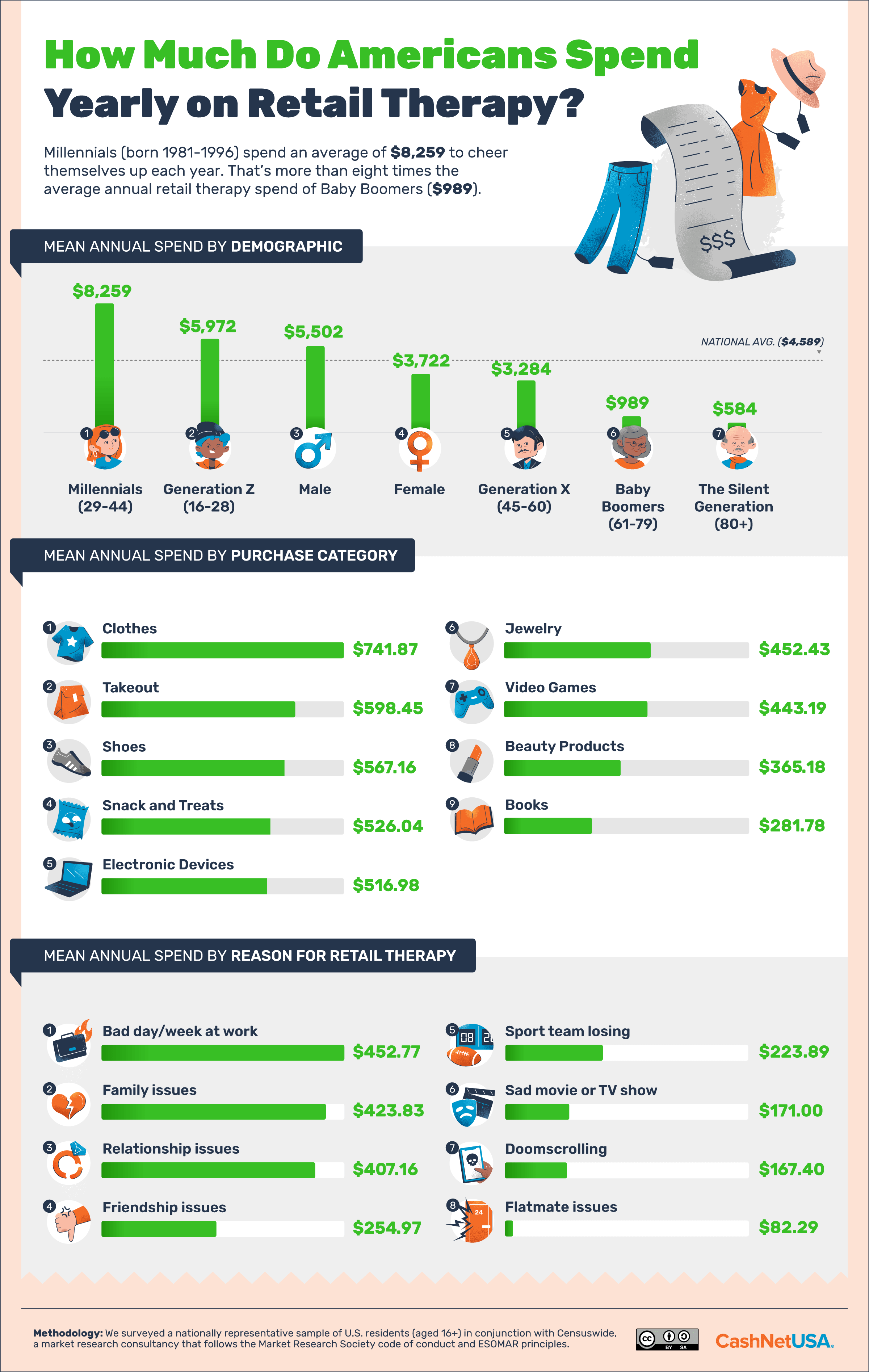 To better understand the phenomenon of retail therapy and provide consumers with information to fight it, CashNetUSA surveyed 2,000 consumers about their shopping patterns. The survey was done in conjunction with the survey consultancy Censuswide, and consisted of a nationally representative sample of consumers over the age of 16.